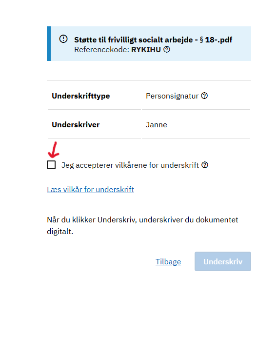 Du skal nu acceptere vilkårene for underskriften. Sæt flueben i boksen.